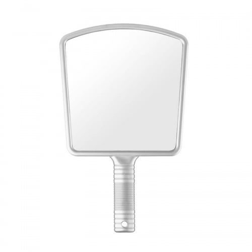 Grote handspiegel, afmetingen 37 cm hoog en 21 cm breed.