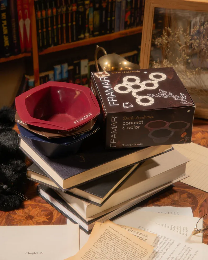 De Framar Connect & Color bowls Dark Academia in 3 prachtige tinten middernacht, kastanjebruin en mahonie, zijn we er vrij zeker van dat u de mooiste creaties maakt. Klik de kommen gewoon in elkaar om je schilderspalet te maken en ga aan de slag met je meesterwerk! Hierdoor zijn de verfbakjes tegelijkertijd te dragen en te gebruiken, super handig! De rubberen basis houdt de bakjes stabiel tijdens het gebruik. De kommen zijn na gebruik gemakkelijk schoon te maken en kunnen eenvoudig in elkaar gestapeld worden. Dit maakt dat je de verfbakjes super gemakkelijk kunt opbergen.